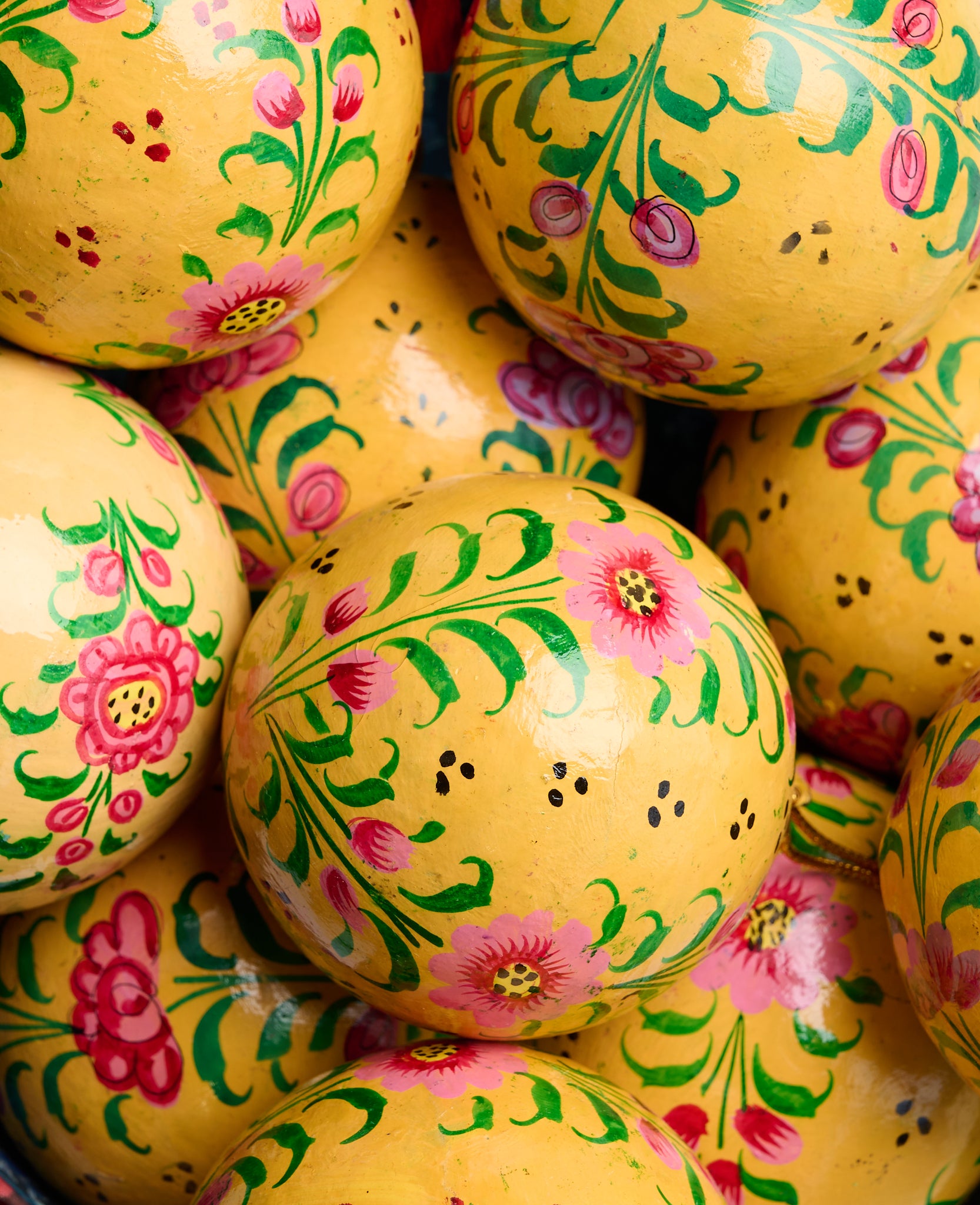 Smukke julekugler håndmalet af indiske håndværkere – hver med sit eget unikke mønster og farvespil. Perfekte til juletræet eller som dekorativ pynt i hjemmet år efter år.